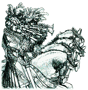 Die Darstellung zeigt fünf Rauschpfeifenspieler aus dem Triumphzug